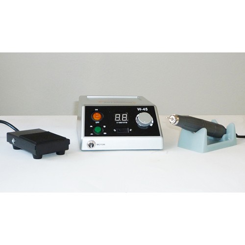 Micromotore ad induzione W-45.  45.000 giri, torque 5,8 Ncm, pedale comando on/off, display a LED a doppia cifra per indicazione del numero dei giri. Dimensioni box di controllo: 190 x 150 x 72 mm.