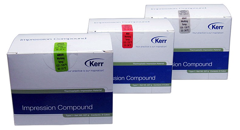 Pasta termoplastica confezionata in placche per impronte parziali e totali o in bastoncini per il bordaggio di impronte totali, per impronte con anelli di rame e cucchiai individuali.