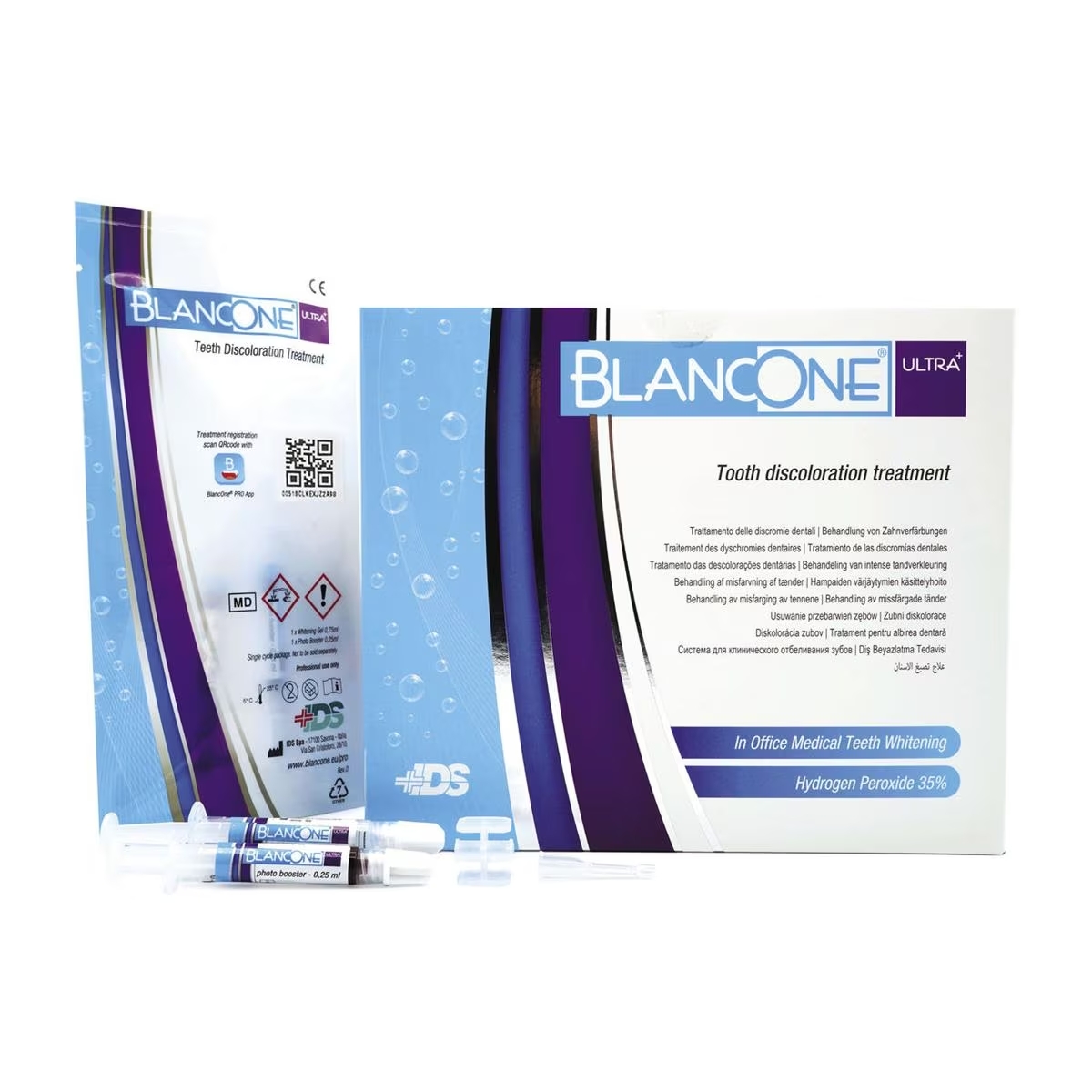 Trattamento professionale in buste monodose con tecnologia biofotonica che sfrutta “realmente” l’energia della luce e non il suo effetto termico, per attivare le molecole di perossido d’idrogeno in ossigeno nascente che si attiva con lampade fotopolimerizzanti con potenza min. 1000 mW/cm2 , lampade al plasma o ad arco. Il gel sbiancante BlancOne Ultra è ottenuto miscelando il perossido di idrogeno liquido (39%) con i cristalli fotodinamici in polvere (Photo Energetic Booster). La concentrazione finale del gel sarà il 29%.