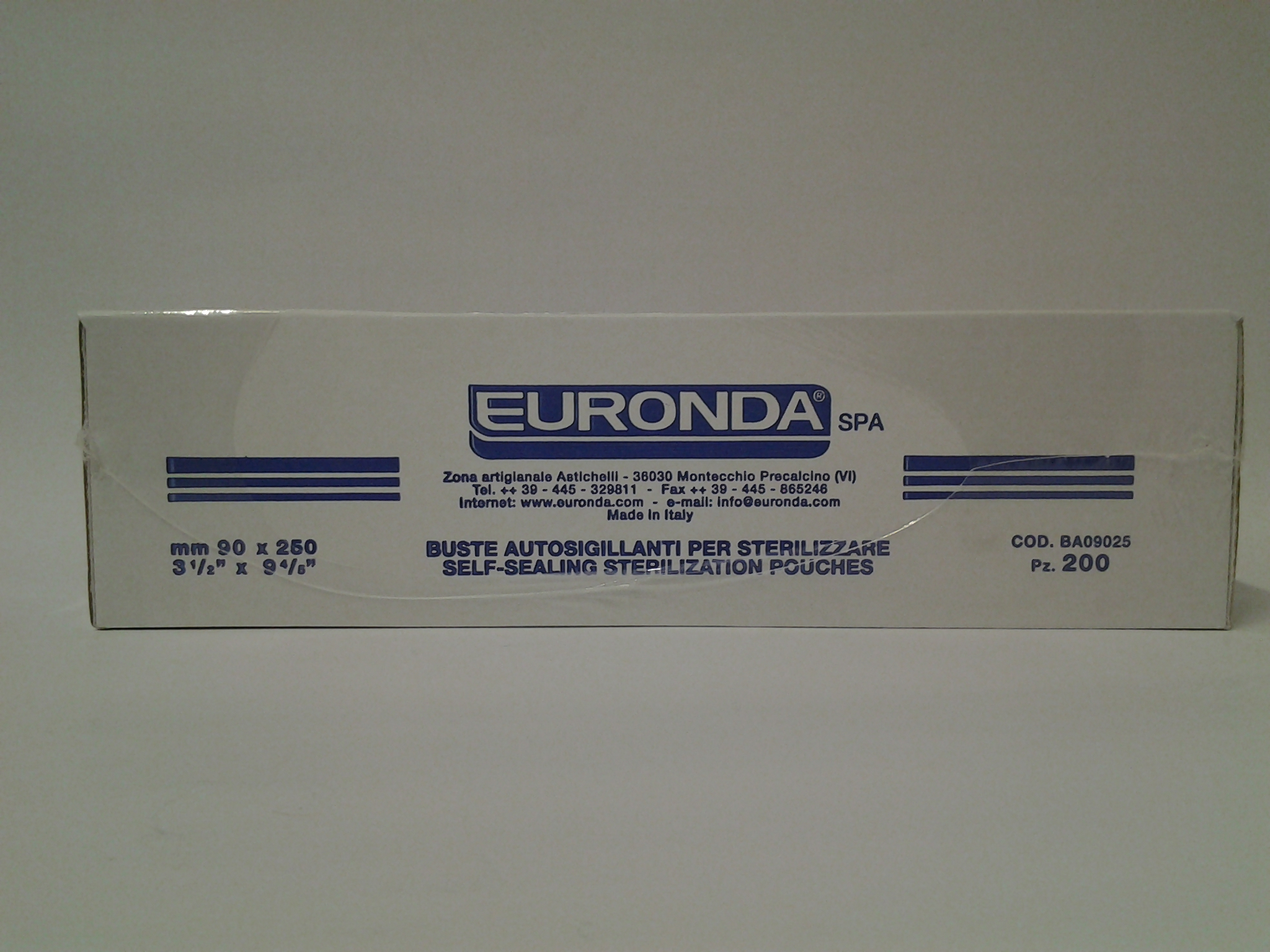 Buste autosigillanti in carta medicale bianca ad elevata grammatura (60g/m2) e doppio strato di film azzurro in poliestere/polipropilene. Tre saldature laterali a canali impermeabili e uniformi per la massima protezione microbica.