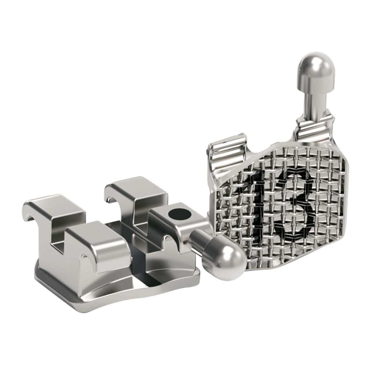 Attacchi LEONE in lega di palladio su retina 80 mesh sinterizzata, che assicura un’ottima adesione al dente con qualsiasi tipo di composito. Ottenuti con tecnica MIM (Metal Injection Moulding). Superfici arrotondate e lucidate in modo da garantire il massimo confort per il paziente e la semplificare la rimozione della placca. La linea centrale tra le alette e punto di riferimento distale-gengivale è marcata laser in modo da aiutare il posizionamento; inoltre su ogni attacco è marcato laser l’identificazione del dente cui è destinato. Sistema MBT 022.